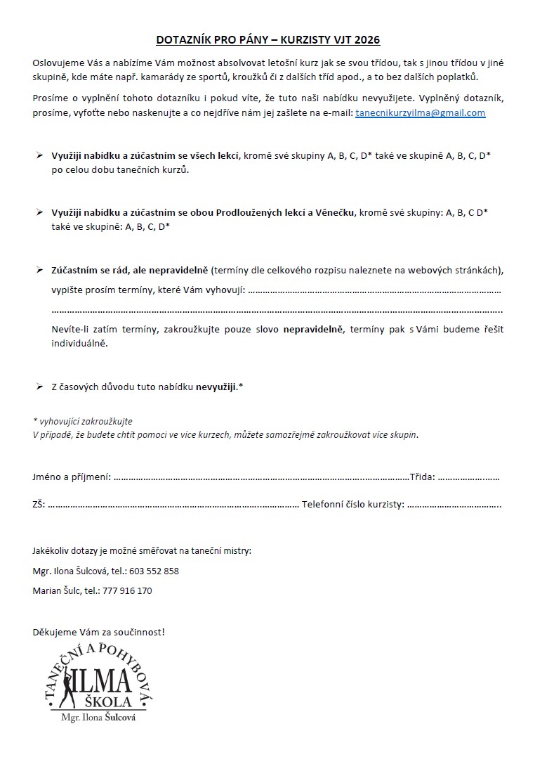 pro Velké regionální taneční 2026 nabízíme mimořádnou nabídku pro pány – kurzisty letošních tanečních. V předešlých letech byly kurzy v počtech dam a pánů vyrovnané nebo chyběly dámy. Letos, po mnoha letech, je tomu obráceně a do počtu nám chybí pánové.